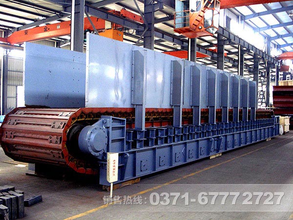 板式喂料機(板式給料機)由電動機、減速器驅動含有齒槽結構的頭部鏈輪轉動,從而使與鏈輪相嚙合的牽引鏈條,牽引裝有物料的輸送槽向前運行。承載機構—牽引鏈在支重輪上行走,托輪托住輸送槽,承受了物料與運行構件的重量。物料由位于尾部上方的儲倉內推落到輸送槽內,隨輸送槽向前運行至頭部罩殼的溜槽口卸出。